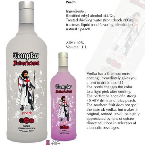 The peach vodka is packaged in a white thermochromic bottle that turns pink in the ice. In the mouth, we get the same sweetness with a subtle aroma of peach, very refreshing